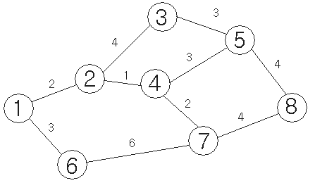 위와 같은 그래프가 있다고 합시다. 그럼 이 그래프를 가지고 1에서 8로 가는 최단거리를 다익스트라를 이용해서 구해 보겠습니다.