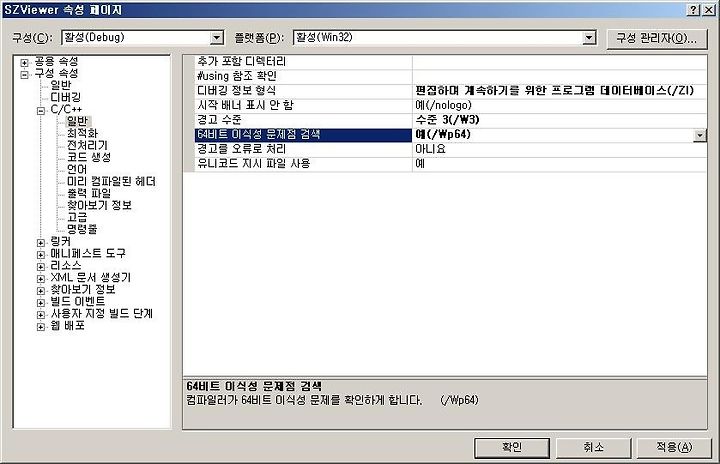 이러한 경고를 없애기 위해서는 프로젝트 속성에서 "64비트 이식성 문제점 검색"