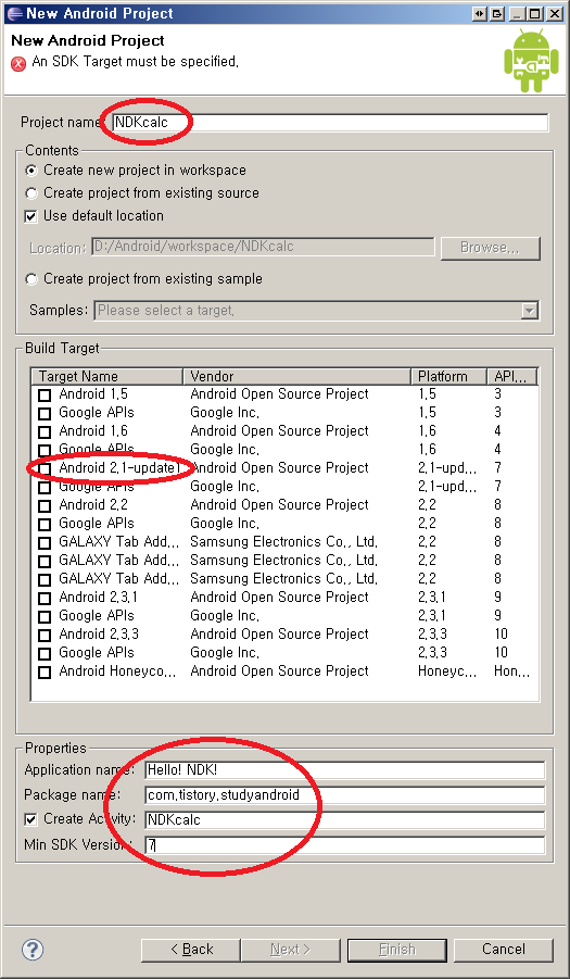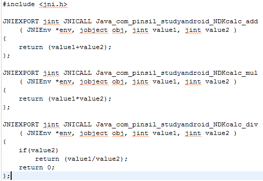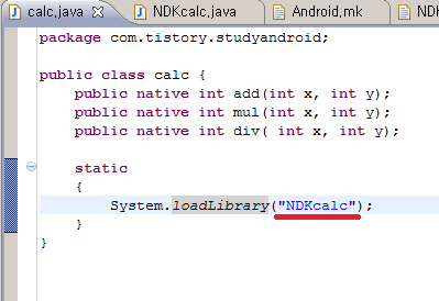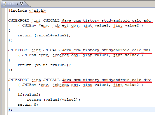 현재 본 포스팅의 5번째 C소스 파일 작성을 보면 아래 그림에 붉은색으로 밑줄 그어져 있는 부분과 다르다는 것을 알게 될 것입니다.완전 초보적인 실.수. 네요... 당연히 전 안드로이드를...보는 3일 초짜입니다. 물론...개발자로서는 오래 있었을지도 모르지만요..(비참하군요..이런 실수를 한다는게..)
