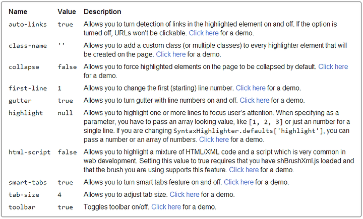 highlight : Allows you to highlight one or more lines to focus user’s attention. When specifying as a parameter, you have to pass an array looking value, like [1, 2, 3] or just an number for a single line. If you are changing SyntaxHighlighter.defaults['highlight'], you can pass a number or an array of numbers. Click here for a demo.